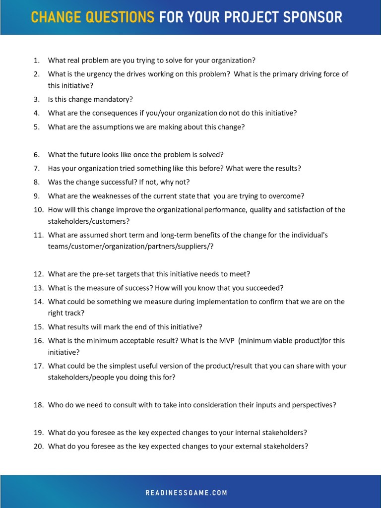With that approach in mind (and knowing that this is only the first of the many conversations on change with your sponsor), I am sharing this (relatively) short version of my list of initial questions).
